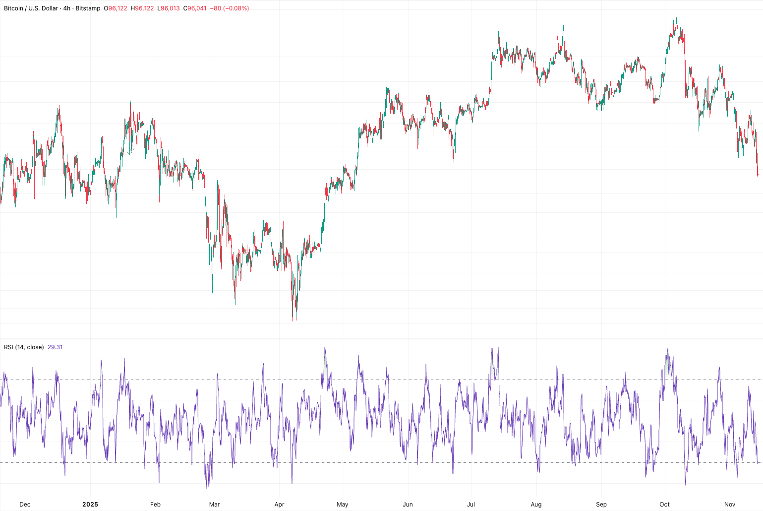 The message for traders is that smaller time frames often exaggerate fear and momentum. The four hour chart captures the current liquidation cycle but the daily and weekly charts still show a market that has trended higher all year. A sustained reclaim of the one hundred thousand level would stabilize the short term picture. Until then the bias on the lower time frame remains downward while the higher time frames continue to argue that the primary uptrend is not broken.
