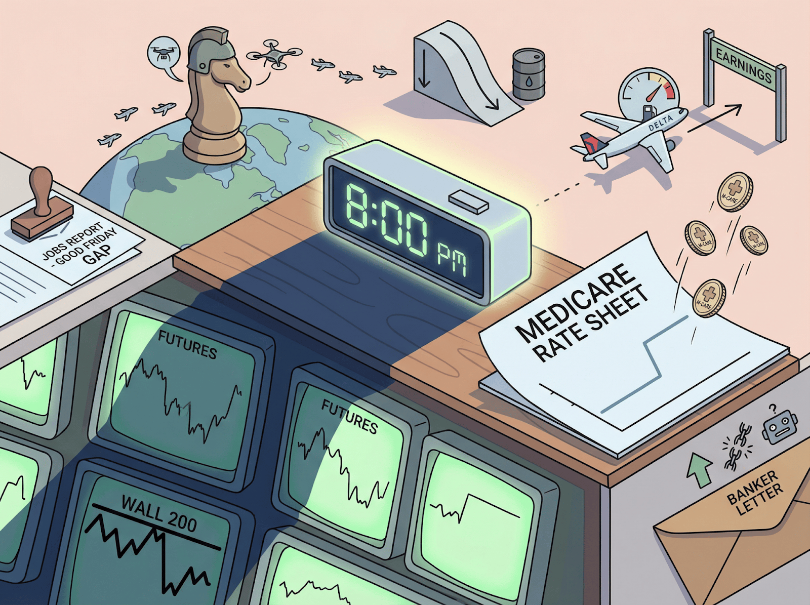 Defense continues to price a longer war. Managed care just got a margin tailwind no one expected three months ago. The tell for which trade has legs is whether tonight's deadline produces a deal or an escalation.