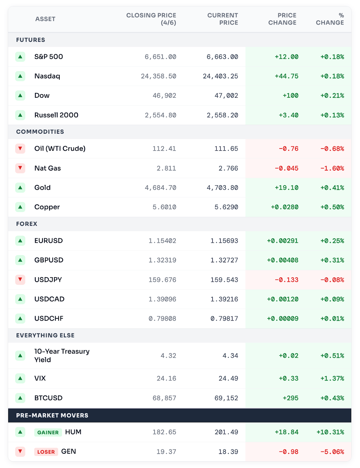 The Nasdaq led. The Dow followed. The rally has been steady but thin. Futures are barely green this morning as the Trump deadline for Iran closes in.
