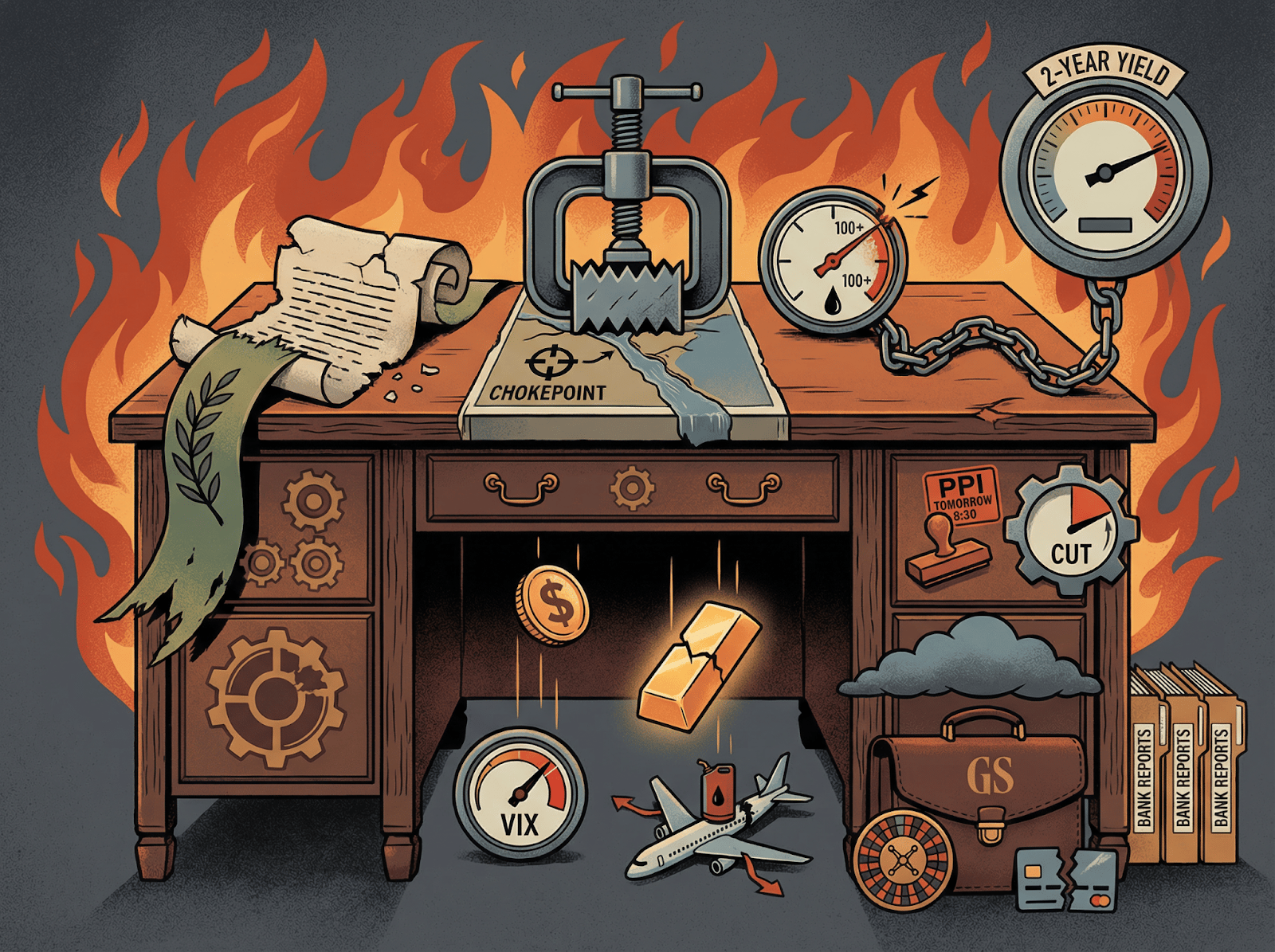 The chain is direct. Blockade tightens supply. Oil goes up. Oil feeds into costs. PPI lands tomorrow. If it's hot, the Fed's last cut for this year is gone.