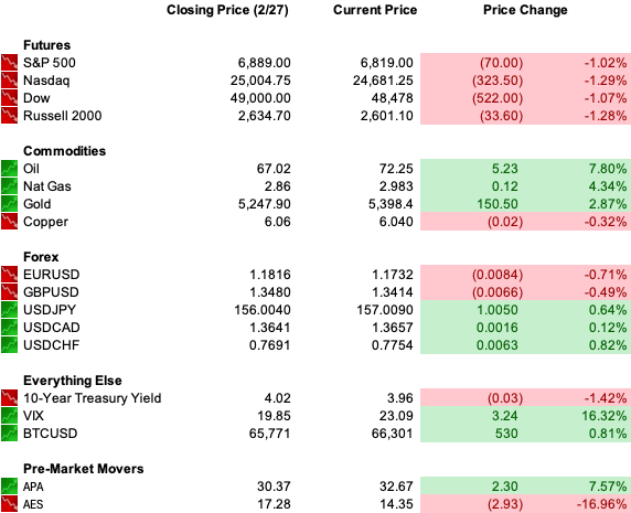 The S&P enters this session already bruised, with February closing down nearly 1% for the month and the iShares Expanded Tech-Software ETF (IGV) off close to 10%. The AI valuation reset was underway before a single bomb dropped. This open layers a geopolitical shock on top of a sector that was already repricing.