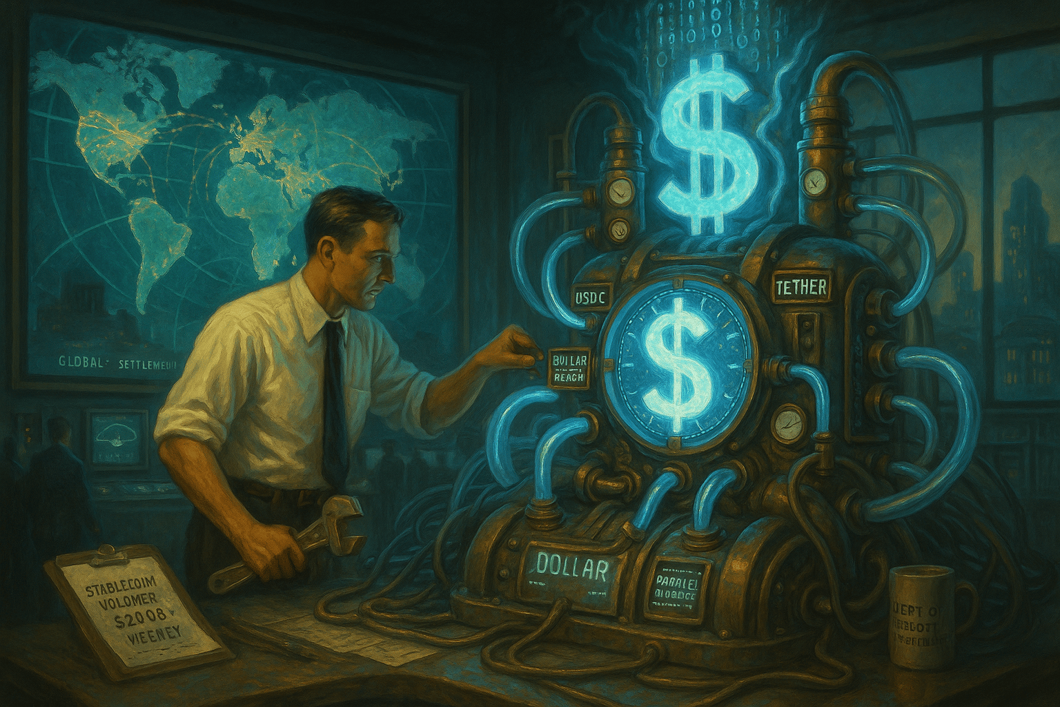 That “genius” lies in how these coins merge crypto plumbing with traditional credit mechanics. Instead of challenging central banks, they’re evolving into a parallel settlement layer that’s faster, global, and quietly dollar-dominant. Johnson notes that stablecoins now move hundreds of billions weekly, rivaling SWIFT volumes in emerging markets, and argues that they’ve become an informal U.S. export: liquidity without permission.