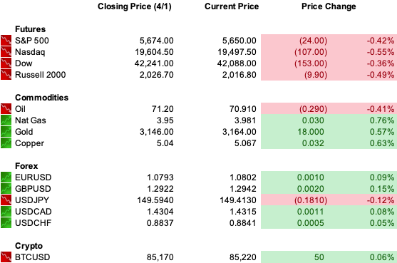 Good morning. Markets begin the day cautiously higher as investors await details of the White House’s reciprocal tariff policy expected to be unveiled later today. The announcement could help reset the tone for markets, which have been volatile since mid-February as tariff-related uncertainty, sticky inflation, and uneven economic data weighed on sentiment.