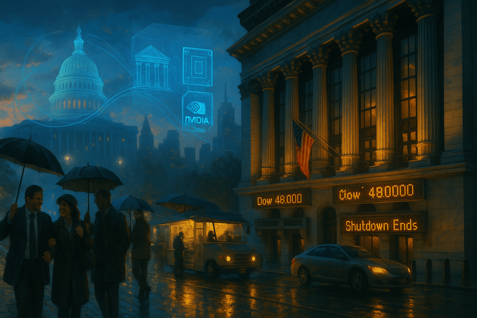 The Dow punched through and traders finally priced in the end of the 43-day shutdown saga. Under the surface, though, the tape still looked fractured: tech flinched, oil tanked, and everyone’s waiting for real data to come back online.