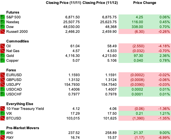 The Dow ripped higher into the close, up and notching a fresh record above 48,000 as traders bet the 43-day government shutdown finally dies this week. The S&P 500 barely budged and the Nasdaq slipped 0.50% — a rotation day, plain and simple.