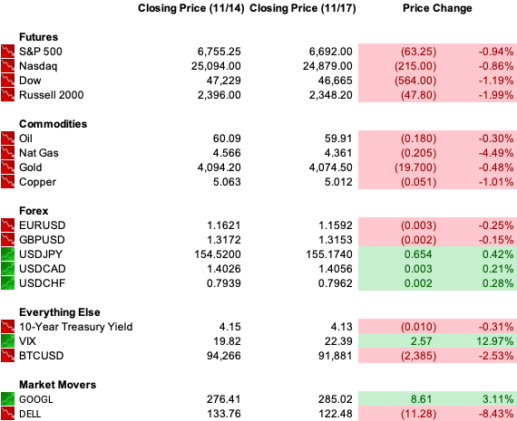 By afternoon, the Dow was off 700 points, the S&P slipped below its 50-day, and the Nasdaq logged another controlled bleed as AI leadership lost footing ahead of Nvidia’s print.