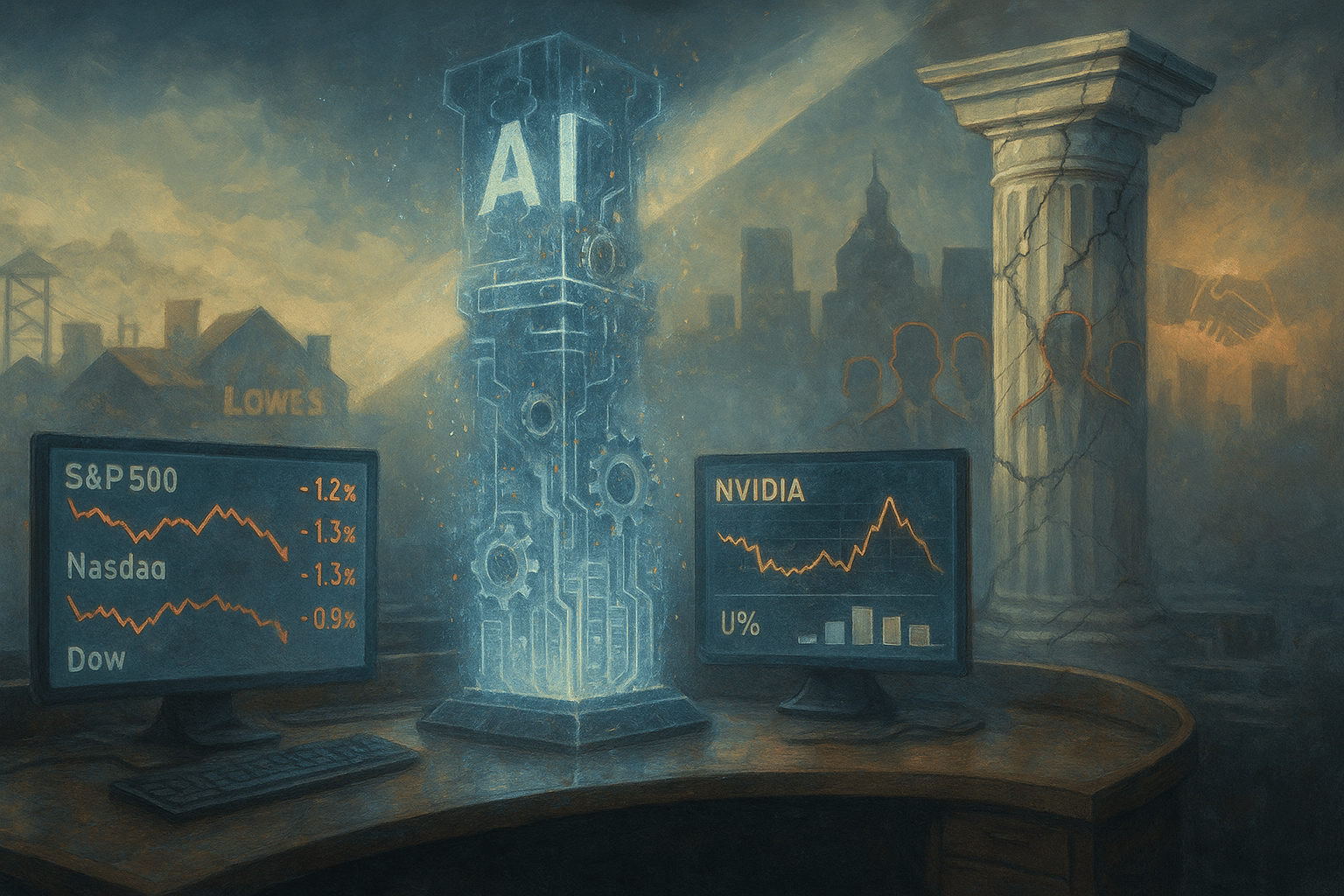 Home Depot weighed on the Dow after cutting its outlook and flagging weaker home-improvement demand, subdued consumer spending, and a lack of storm-driven sales. Lowe’s now becomes Wednesday’s read-through for the category.