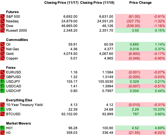 Sector boards told the story: tech and discretionary led the drag, communication services caught a lift from META, and utilities picked up a modest safety bid. With Thursday’s delayed jobs report and NVIDIA tomorrow, traders reduced exposure rather than wait for clarity to arrive.