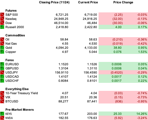 Ahead of Tuesday’s open, futures are softer, Nvidia is under pressure as the AI-semis landscape recalibrates around Alphabet’s momentum, and traders are preparing for a heavy slate of delayed economic data, including retail sales and PPI, that will shape the Fed’s December path in the absence of CPI or labor reports.