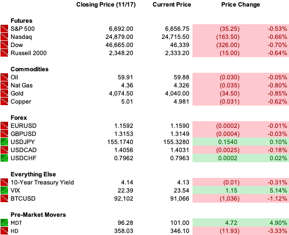 Futures are stabilizing modestly, but sentiment remains fragile as traders weigh weakening tech leadership, fading expectations for a December Fed cut, and the return of long-delayed economic data.