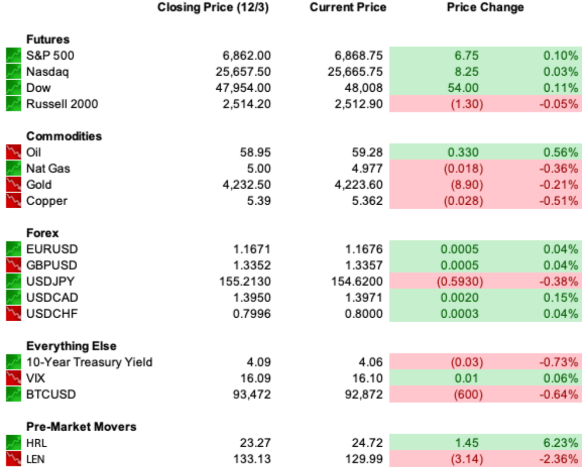 The tone heading into today’s session is cautiously constructive, but still opportunistic rather than committed. S&P futures are essentially flat, Nasdaq futures are modestly higher as traders probe whether megacap tech can extend yesterday’s stabilization, and Dow futures are little changed after a day of cyclical leadership.
