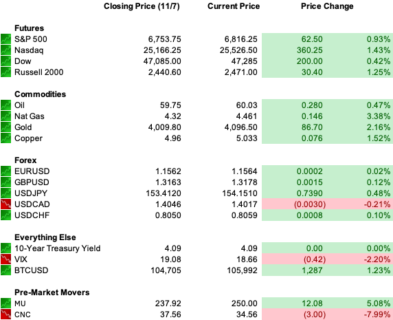 Markets open Monday with cautious optimism as the Senate’s compromise edges the U.S. closer to ending the longest government shutdown on record. Futures point to modest gains after Friday’s dramatic reversal, suggesting investors are ready to reward any sign of resolution.