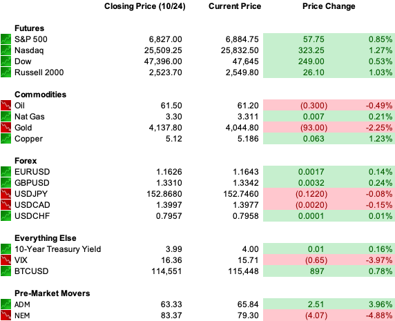 The S&P, Nasdaq, and Dow are all set to start the week at new all time highs. Oil eased back after last week’s sanctions-driven spike, while gold remained steady near $4,130 an ounce.