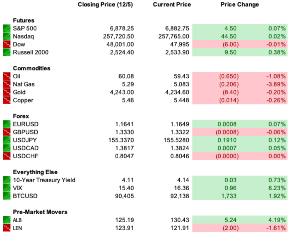 U.S. equity futures are modestly higher with the S&P 500 hovering just below record territory after nine wins in the last ten sessions. The Nasdaq continues to lead as rate cut expectations support duration-sensitive assets, while small caps have stalled just below recent highs.